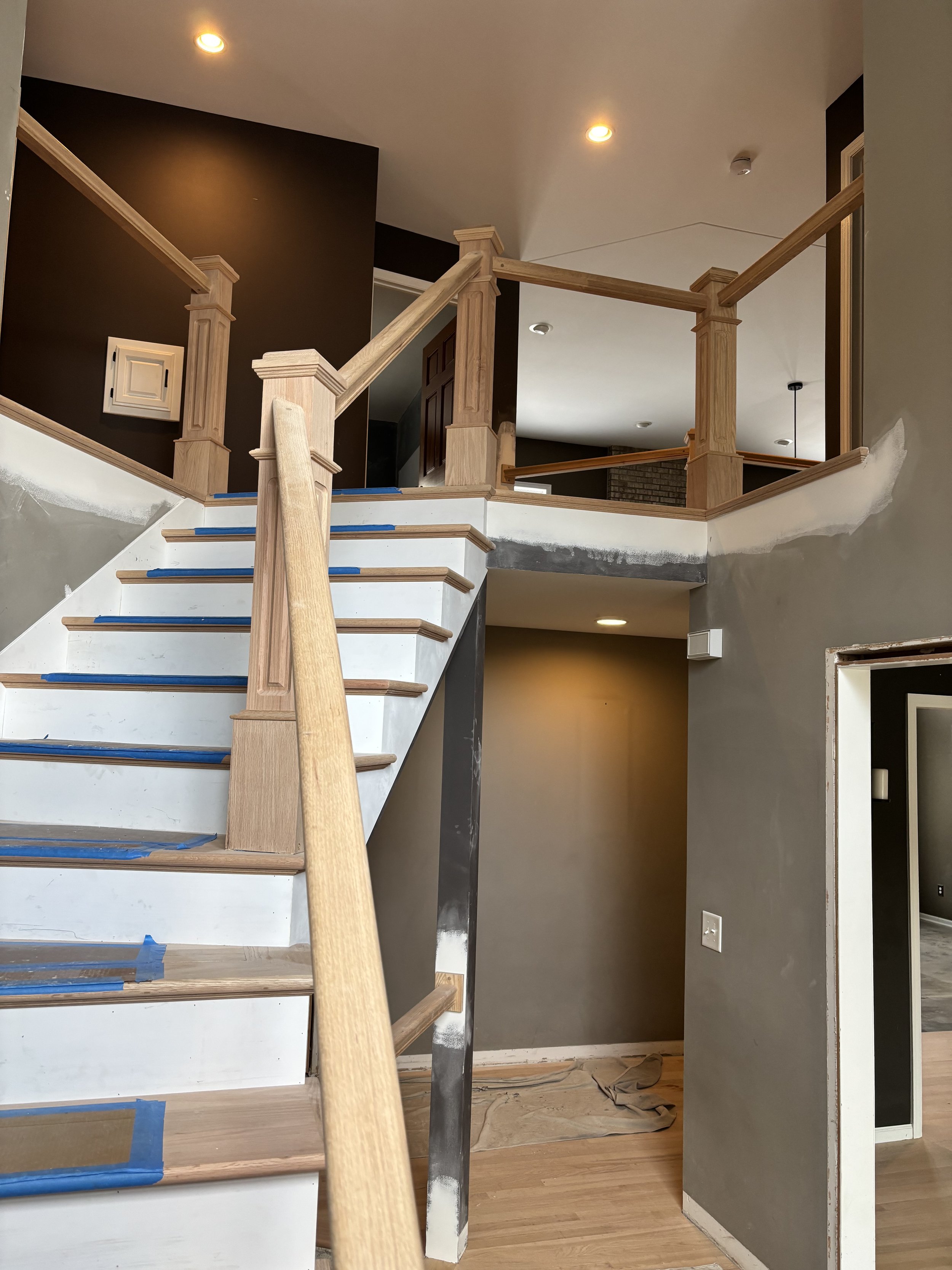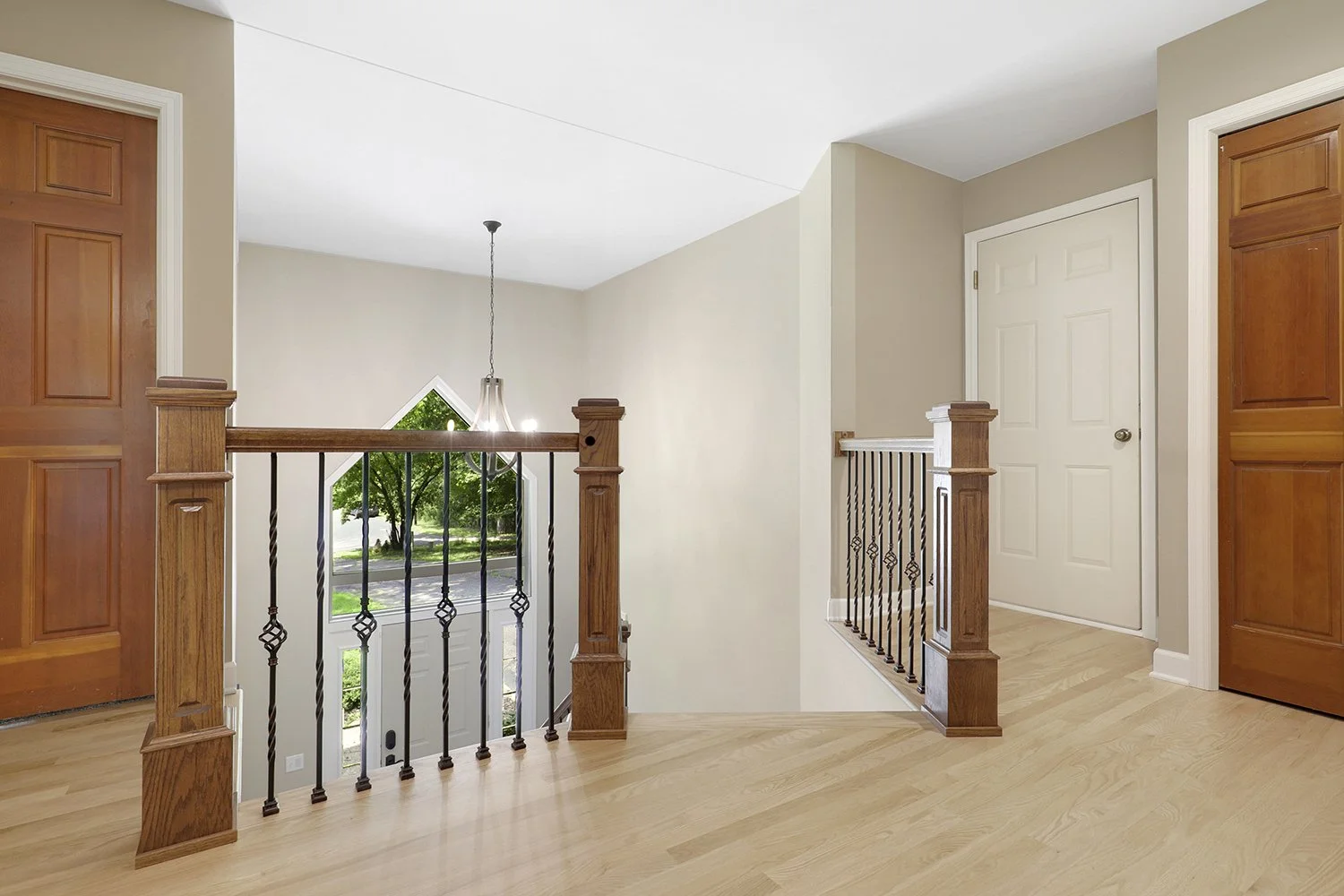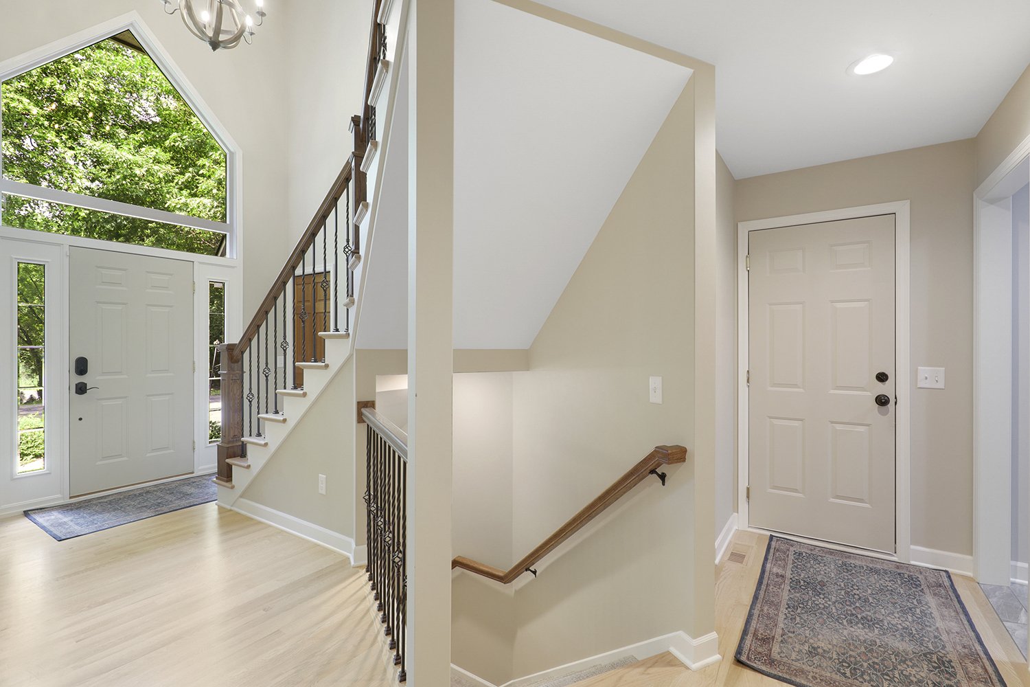 We especially like the dual-toned cabinets and countertops. The mix of light and dark colors adds interest and creates a rich background. The new storage is also a highlight and makes the kitchen very organized. In the living room, fresh paint, a new staircase, and an updated upstairs railing help bring the main floor together.