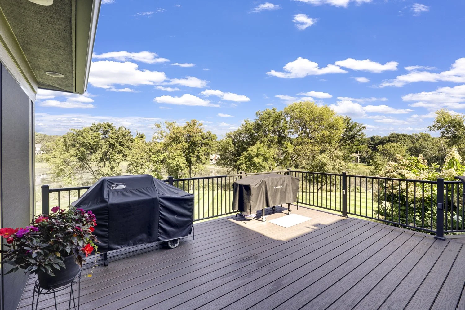 The second headliner of this project is the incredible screened porch. It features rustic wood paneling, a stone fireplace, multiple seating levels, a beautiful backyard view, and access to the sunny deck. Wasn’t the porch made for a crisp Midwest afternoon in the fall? We can imagine curling up by the fire with a blanket, a book, and a mug of cider!